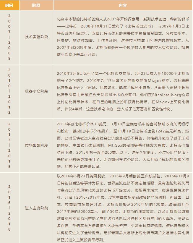 區(qū)塊鏈是由一系列技術(shù)實現(xiàn)的全新去中心化經(jīng)濟組織模式,2009年誕生于比特幣系統(tǒng)的構(gòu)建,2017年成為全球經(jīng)濟熱點,但區(qū)塊鏈的成功應(yīng)用寥寥,這個新興產(chǎn)業(yè)還遠未成熟。其發(fā)展大體可劃分為六個階段。