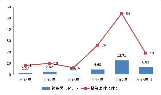 區(qū)塊鏈項目融資從2013年至2016年呈小幅上漲趨勢。由于2015年的政策監(jiān)管,導致2015年區(qū)塊鏈的投資熱度有所下降,在2017年VC大舉入局,投資額達12億。2018年1月,區(qū)塊鏈行業(yè)融資額和融資事件已經(jīng)超過2016年。