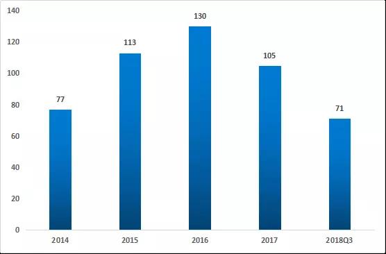 從融資數(shù)量來(lái)看,截止2018年第三季度已發(fā)生的融資事件為71件,2017至2018年融資事件較前三年熱度有所回落,可以看出資本的支撐更加的冷靜。