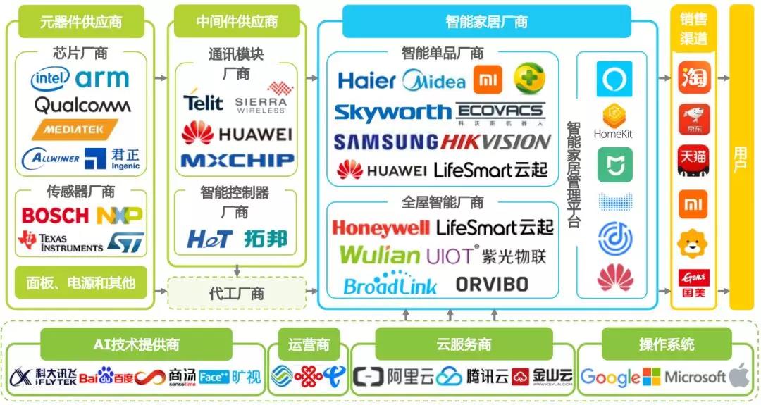 通常所指的智能家居企業(yè)為智能家居品牌商,涵蓋向最終用戶提供終端產(chǎn)品、解決方案和設(shè)備管理控制平臺(tái)的企業(yè),底層除物聯(lián)網(wǎng)操作系統(tǒng)、云服務(wù)作為管理控制平臺(tái)的支撐外,還包括內(nèi)容服務(wù)、生活服務(wù)等互聯(lián)網(wǎng)增值服務(wù)。智能家居產(chǎn)業(yè)鏈上游主要是芯片、傳感器等元器件供應(yīng),以及通訊模塊和智能控制器等中間件供應(yīng)商。品牌商可以通過(guò)線上、線下零售渠道直接向C端用戶銷(xiāo)售終端產(chǎn)品,也可以面向房地產(chǎn)、家裝公司等B端客戶提供整體解決方案。