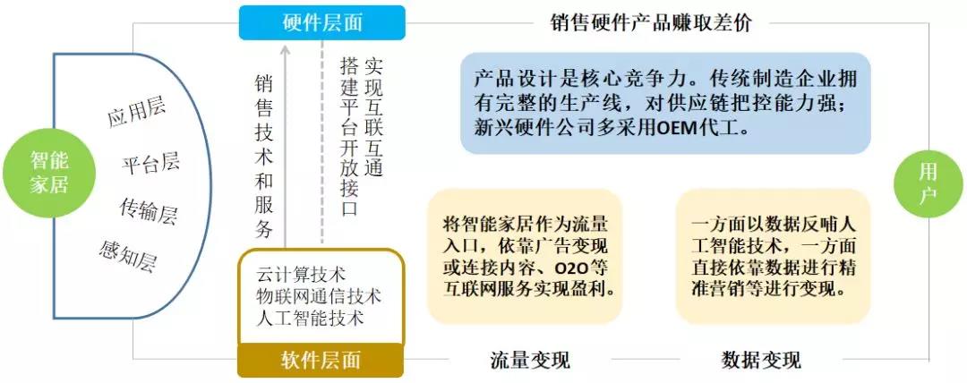 將智能家居劃分為硬件和軟件兩個(gè)層面,其中硬件對(duì)應(yīng)于智能家居的應(yīng)用層,軟件對(duì)于智能家居的平臺(tái)層、傳輸層和感知層。硬件產(chǎn)品的品牌方專(zhuān)注于產(chǎn)品側(cè)的設(shè)計(jì)和制造,向終端用戶提供的是智能家居的物理屬性,通過(guò)銷(xiāo)售硬件賺取差價(jià)實(shí)現(xiàn)盈利。針對(duì)智能家用產(chǎn)品的云計(jì)算、物聯(lián)網(wǎng)通信和人工智能三項(xiàng)核心技術(shù),技術(shù)供應(yīng)商通常會(huì)提供其中的一項(xiàng)或多項(xiàng)能力。他們既可以選擇直接通過(guò)向硬件廠商銷(xiāo)售技術(shù)和服務(wù)變現(xiàn),也可以選擇以硬件產(chǎn)品連接到海量的終端用戶,利用獲取到的用戶流量和數(shù)據(jù),通過(guò)面向消費(fèi)者的互聯(lián)網(wǎng)服務(wù)和面向企業(yè)的數(shù)據(jù)服務(wù)進(jìn)行變現(xiàn)。