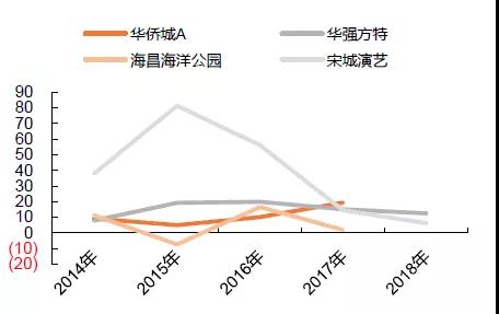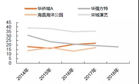 宋城演藝凈利潤規(guī)模僅次于華僑城,2014-2016年由于異地復制的新項目開業(yè),以及收購六間房,營收和凈利潤增速遠高于其他主題公園集團。宋城演藝的主題公園建設(shè)所需投入較低,每個主題公園大約只需5-10億元,遠低于其他主題公園幾十億甚至上百億的投入,因此資產(chǎn)負債率很低,不到20%。宋城演藝主題公園盈利能力較強,ROE16%左右,高于行業(yè)平均水平,且保持穩(wěn)步提升。